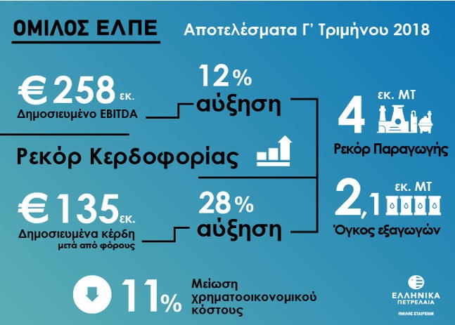 «Το Γ΄ τρίμηνο του 2018 ο Όμιλος ΕΛΠΕ σημείωσε ιδιαίτερα ισχυρές επιδόσεις επιβεβαιώνοντας την ηγετική του θέση στον κλάδο της ενέργειας στη Νοτιοανατολική Ευρώπη. Παράλληλα, ιδιαίτερα ισχυρή παραμένει η χρηματοοικονομική θέση του Ομίλου, καθώς η ολοκλήρωση του προγράμματος αναχρηματοδότησης για το 2018, οδήγησε σε μείωση δανεισμού (1,8 δισ. ευρώ) και περαιτέρω μείωση χρηματοοικονομικού κόστους (-11%).