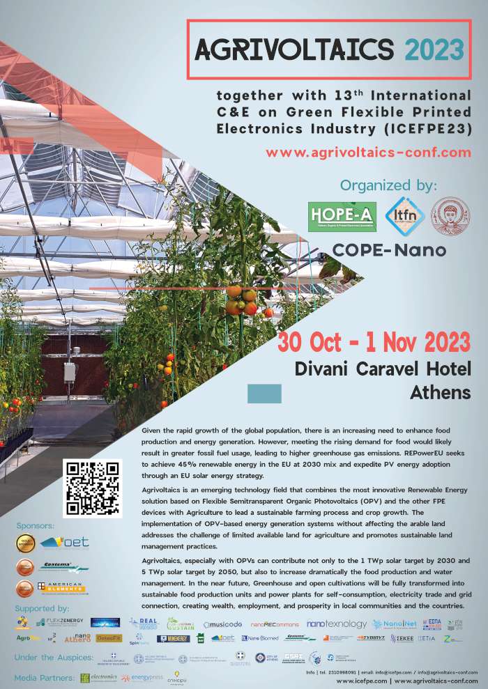 In Athens (Divani Caravel 30 October-1 November) during the 3rd International Conference and Exhibition for the Green Flexible Printed Electronics Industry (ICEEPE23) & Agrivoltaics the pioneers of the Green European Industry meet to announce their new achievements and discuss new trends in the global market.