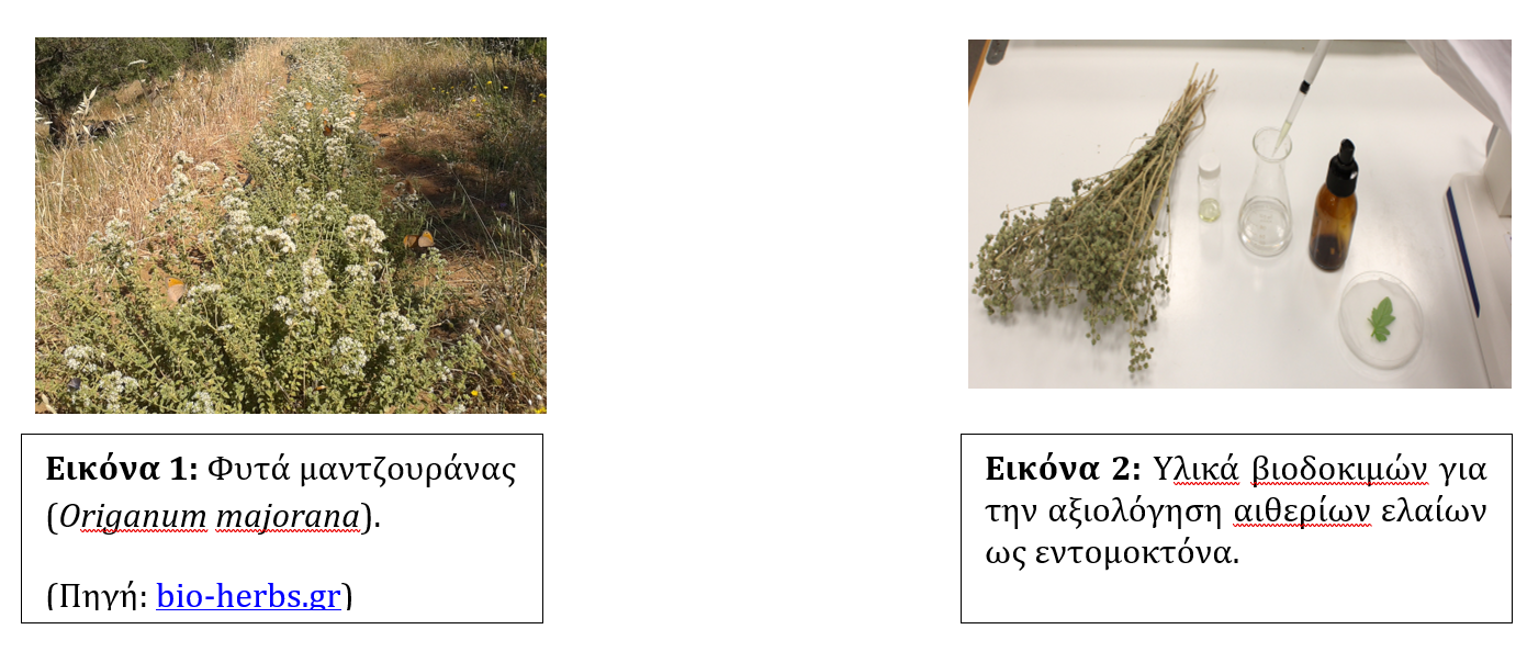 Η συνεισφορά του Εργαστηρίου Γεωργικής Ζωολογίας και Εντομολογίας του ΓΠΑ περιλαμβάνει την αξιολόγηση α) της τοξικής δράσης αιθερίων ελαίων και των αντίστοιχων εγκλεισμένων ελαίων από αρωματικά φυτά (Eικόνα 1) και εσπεριδοειδή στα διαφορετικά στάδια (ωά, προνύμφες, νύμφες και ενήλικα άτομα) εντόμων-εχθρών, β) της απωθητικής δράσης τους και γ) τυχόν αρνητικών επιδράσεων τους σε ωφέλιμα έντομα (φυσικούς εχθρούς και επικονιαστές) (Εικόνα 2). Επιλεγμένα εγκλεισμένα αιθέρια έλαια θα δοκιμαστούν σε συνθήκες αγρού για τελική επιλογή ώστε να ξεκινήσει η εμπορική τους αξιοποίηση.