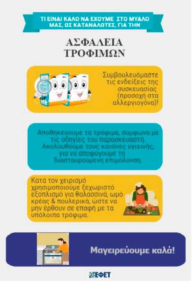 για να κάνουμε ασφαλείς επιλογές. Υπάρχουν, επίσης, οδηγίες στη συσκευασία για το σωστό μαγείρεμα των τροφίμων όπως τα όσπρια, τα ζυμαρικά, τα κατεψυγμένα λαχανικά και τα κατεψυγμένα αλιεύματα. Στα κατεψυγμένα αλιεύματα, πρέπει πάντα να υπάρχει το χαρακτηριστικό σήμα αναγνώρισης της εγκατάστασης, όπου καταψύχθηκε το προϊόν. Τα αποψυγμένα προϊόντα, έχουν σαφή δήλωση της αποψυγμένης τους κατάστασης στην επισήμανση της συσκευασίας ή στις πινακίδες των χύμα προϊόντων (χύδην τρόφιμα).
