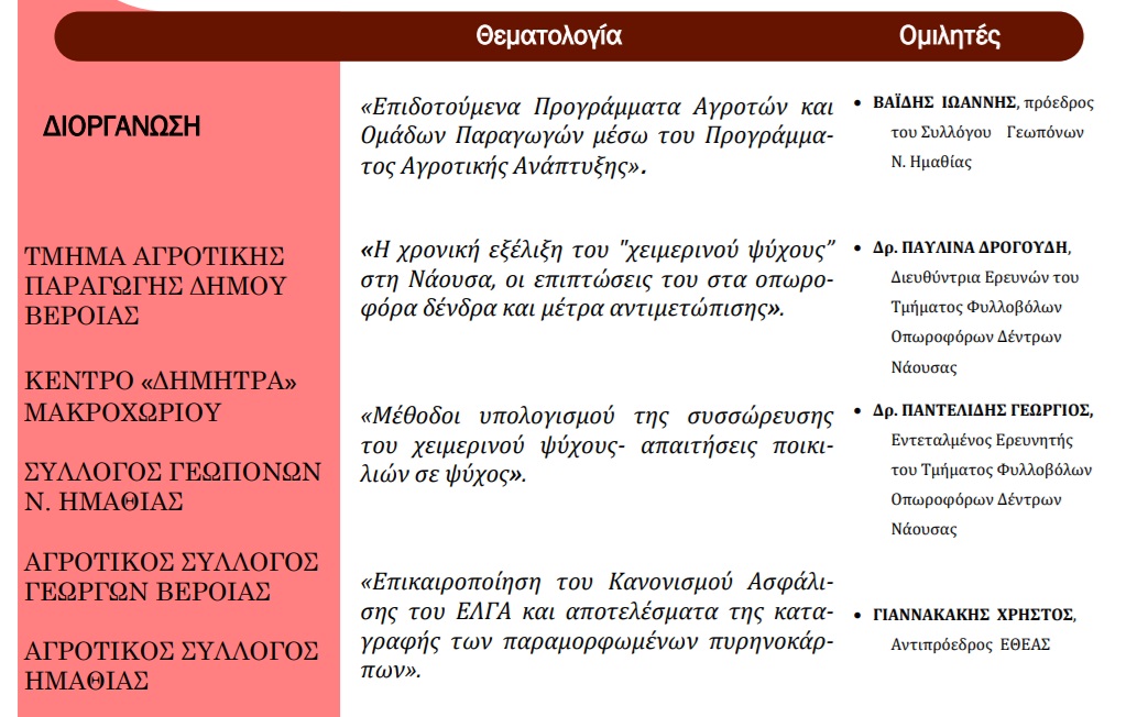 19:10 Εισήγηση της Δρ. ΠΑΥΛΙΝΑΣ ΔΡΟΓΟΥΔΗ, Διευθύντρια Ερευνών του Τμήματος Φυλλοβόλων Οπωροφόρων Δέντρων Νάουσας με θέμα: «Η χρονική εξέλιξη του “χειμερινού ψύχους” στη Νάουσα, οι επιπτώσεις του στα οπωροφόρα δένδρα και μέτρα αντιμετώπισης».
