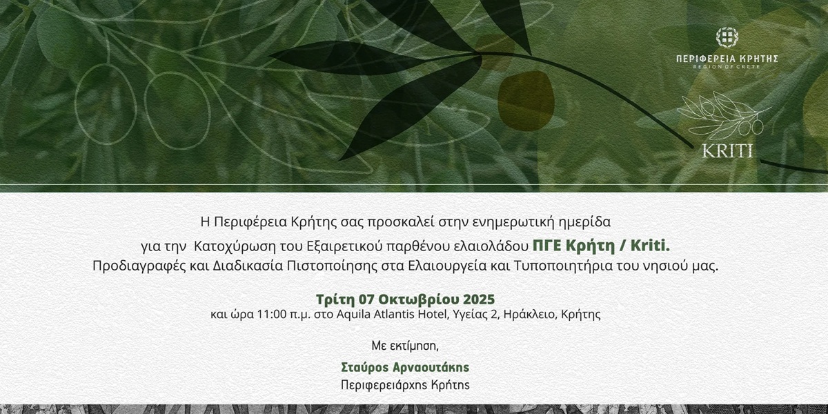 Η πρόσφατη, επίσημη αναγνώριση του «Εξαιρετικού Παρθένου Ελαιολάδου Κρήτη / Kriti» ως προϊόντος Προστατευόμενης Γεωγραφικής Ένδειξης (ΠΓΕ) από την Ευρωπαϊκή Ένωση, αποτελεί την επιτυχή κατάληξη πολυετών και συντονισμένων προσπαθειών της Περιφέρειας Κρήτης και των φορέων του νησιού, για το πολυτιμότερο αγροτικό προϊόν του τόπου. Στο πλαίσιο αυτής της καθοριστικής εξέλιξης, και με στόχο την άμεση και πλήρη ενημέρωση όλων των παραγωγικών φορέων, η Περιφέρεια Κρήτης διοργανώνει εξειδικευμένη ενημερωτική ημερίδα, αύριο Τρίτη 7 Οκτωβρίου 2025 στις 11:00 π.μ. Στο ξενοδοχείο Aquila Atlantis στο Ηράκλειο