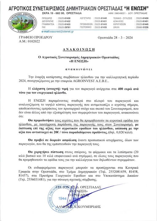 Σύμφωνα με ανακοίνωσή της η Ένωση θα πριμοδοτήσει τους αγρότες που θα προμηθευτούν τα αγροτικά εφόδια ηλίανθου, με ταυτόχρονη παράδοση της παραγωγής τους στον Συνεταιρισμό, με έκπτωση επί της αξίας των αγροτικών εφοδίων του ηλίανθου, ισόποση με την αξία που αντιστοιχεί σε 20 ευρώ/τόνο παραδιδόμενου προϊόντος, δηλαδή 0,02 ευρώ/κιλό.