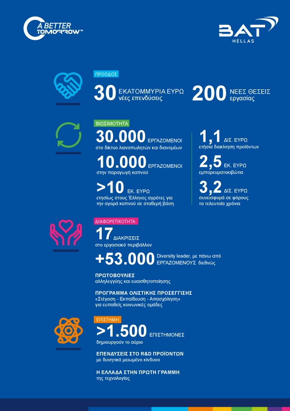 Eπενδυτικό πλάνο στην Ελλάδα ύψους τουλάχιστον 30 εκατομμυρίων ευρώ με άξονα την υψηλή τεχνολογία και τη δημιουργία 200 νέων θέσεων εργασίας που δημιουργούνται από την επένδυσή της, ανακοίνωσε η British American Tobacco, ένας από τους μεγαλύτερους Ομίλους διεθνώς, επιλέγοντας τη χώρα ως μία από τις πιο σημαντικές αγορές διεθνώς για την ανάπτυξη των προϊόντων του Ομίλου glο Hyper με θέρμανση αντί για καύση καπνού.