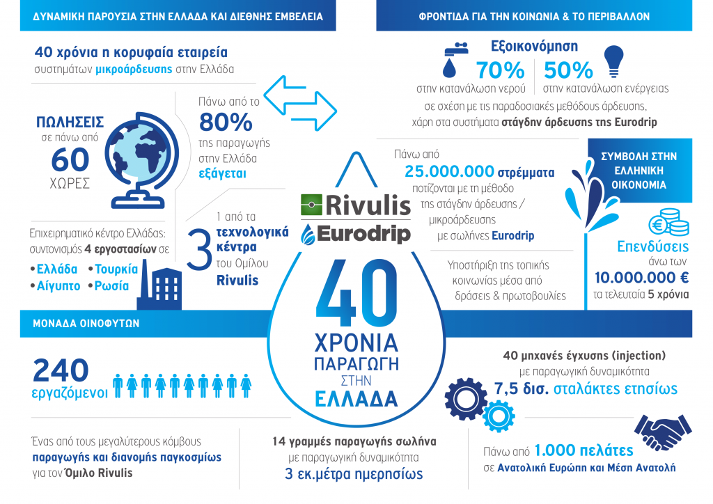 Η Rivulis–Eurodrip, εταιρεία τεχνολογιών μικροάρδευσης, μέλος του διεθνούς Ομίλου Rivulis, συμπληρώνει φέτος 40 χρόνια ισχυρής και σταθερής δραστηριότητας στην Ελλάδα και θέτει τις βάσεις για ένα μέλλον με προοπτικές ανάπτυξης στην ελληνική και διεθνή αγορά.