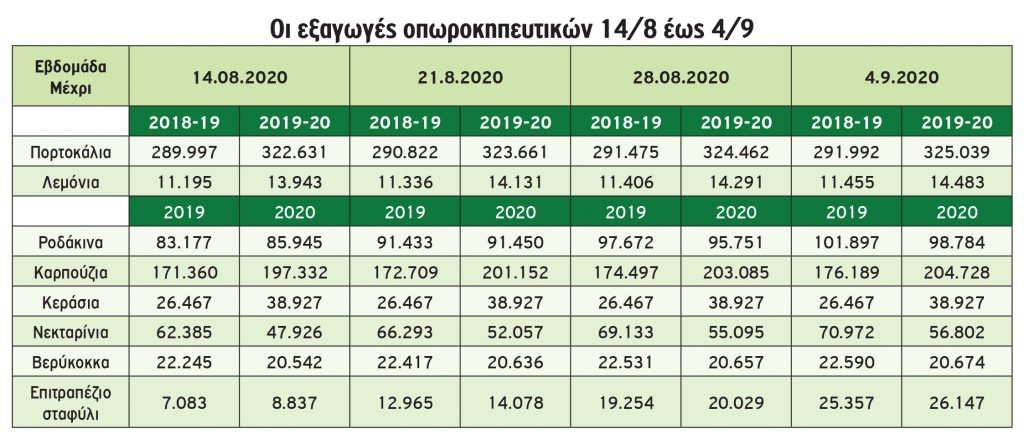Οι εξαγωγές επιτραπέζιων σταφυλιών συνεχίζονται με τη ζήτηση στην αγορά να εμφανίζεται βελτιωμένη όσον αφορά αυτή την περίοδο του έτους. Αυτό μπορεί να εξηγηθεί από το γεγονός ότι σχεδόν δεν υπάρχουν πια φρούτα στην αγορά, οπότε τα σταφύλια παίρνουν τη θέση τους.