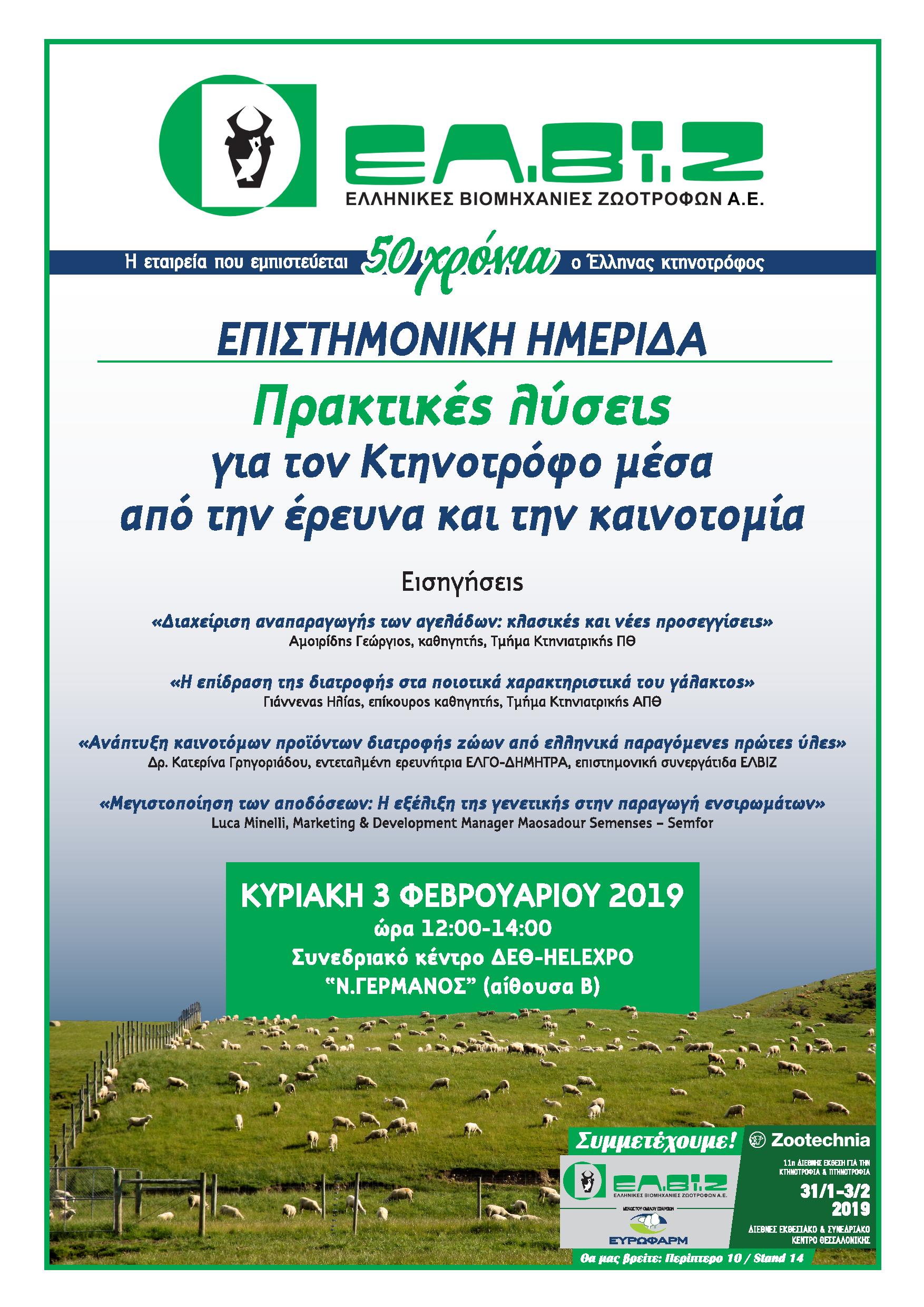 Επιστημονική ημερίδα στο πλαίσιο της 11ης Zootechnia διοργανώνει την Κυριακή 3 Φεβρουαρίου 2019, στο Συνεδριακό Κέντρο ΔΕΘ «Ν.Γερμανός» στις 12:00 π.μ. η ΕΛΒΙΖ ΑΕ. Η επιστημονική ημερίδα θα έχει θέμα: «Πρακτικές λύσεις για τον Κτηνοτρόφο μέσα από την Έρευνα και την Καινοτομία».