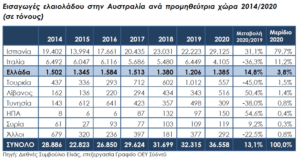 Με την κατανάλωση ελαιολάδου στην Αυστραλία να παρουσιάζει μία σταθερά αυξητική τάση σε απόλυτα μεγέθη, αλλά και σε σύγκριση με άλλα βρώσιμα έλαια, η χώρα έφτασε το 2020 να εισάγει 36.558 τόνους ετησίως (3,2% των εισαγωγών παγκοσμίως) αποτελώντας τον έβδομο μεγαλύτερο αγοραστή του προϊόντος.