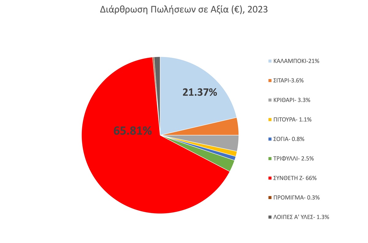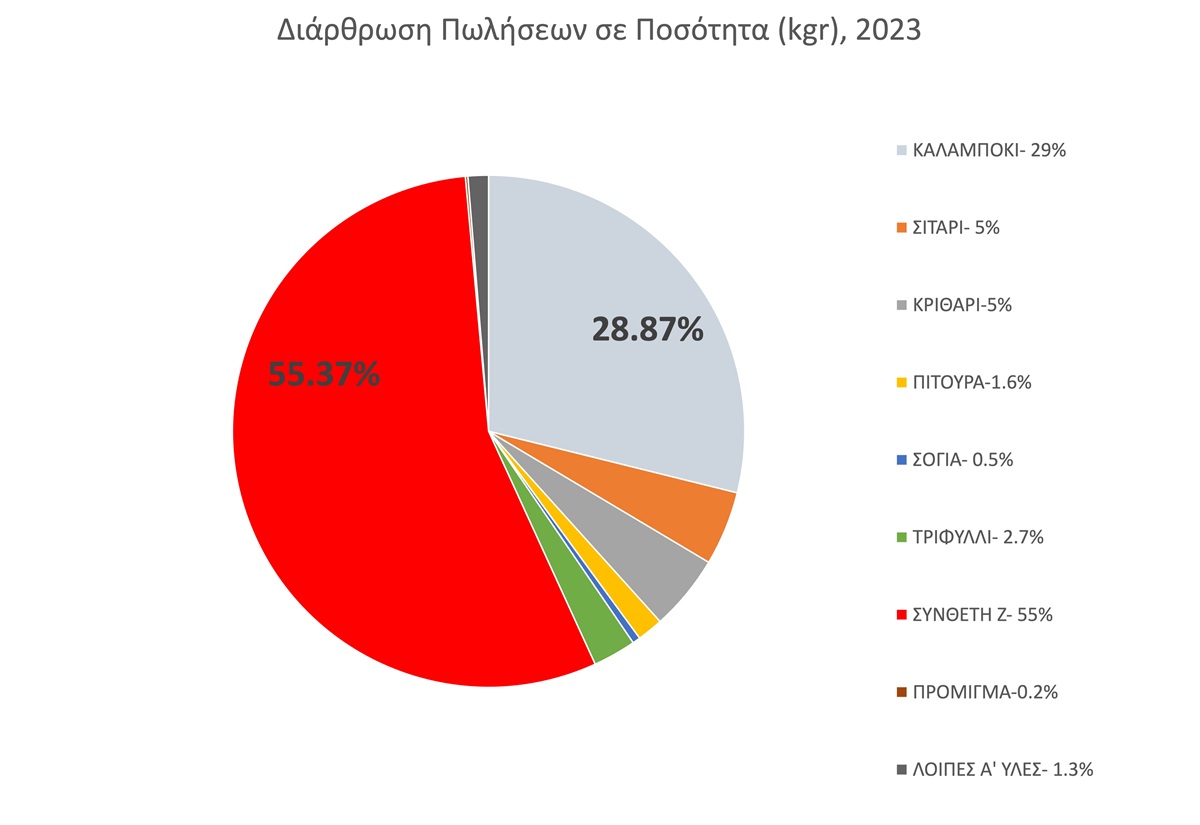 - Αναφορικά με την διάρθρωση των πωλήσεων ζωοτροφών των εταιριών του δείγματος, διαπιστώνεται ότι, τόσο σε αξία όσο και σε ποσότητα, το μεγαλύτερο ποσοστό των πωλήσεων αφορά σε ΣΖ για αιγοπρόβατα (κατά 65,8% σε αξία και κατά 55,4% σε ποσότητα).