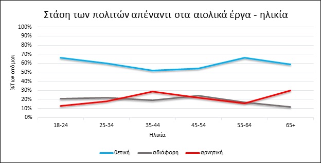 Γενικά οι άνδρες φάνηκαν να έχουν πιο θετική στάση, ενώ, κατά κανόνα, η βιβλιογραφία θέλει γενικότερα τις γυναίκες να είναι πιο ευαίσθητες στα περιβαλλοντικά ζητήματα. Επίσης οι πολύ νεαρές ηλικίες (18-24) είναι πιο θετικές σε αντίθεση με την ηλικιακή ομάδα των 35-54, οι οποίοι εμφανίζονται περισσότερο διστακτικοί απέναντι στα αιολικά.