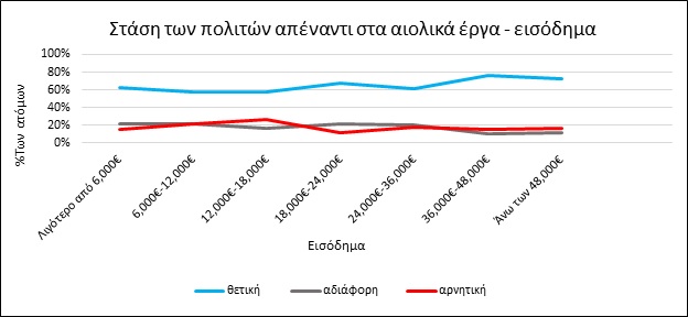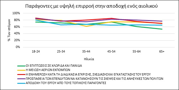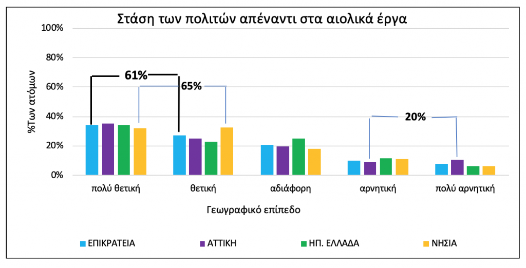 H πλειοψηφία των πολιτών (περισσότεροι από το 60%) είναι θετική απέναντι στα αιολικά έργα (έναντι μόλις 20% που είναι επιφυλακτικοί ή αρνητικοί). Τα αποτελέσματα έρχονται σε σύγκρουση με το φαινόμενο «Όχι στην αυλή μου», με τους Νησιώτες να καταλαμβάνουν την πρώτη θέση όσον αφορά την θετική αντιμετώπιση των αιολικών, ενώ οι κάτοικοι της Αττικής να φαίνονται περισσότερο διστακτικοί από τους υπόλοιπους στην αποδοχή των έργων.