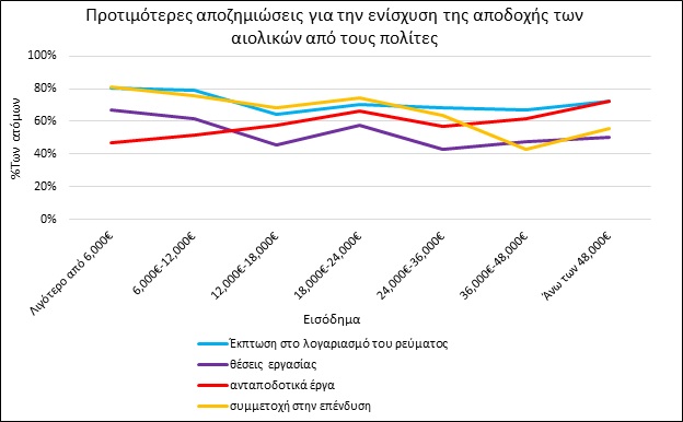 Τέλος, σε σχέση με τις προτιμότερες έμμεσες και άμεσες αποζημιώσεις που δύνανται να δοθούν, έτσι ώστε να ενισχυθεί η ενεργειακή και οικονομική δημοκρατία, διαπιστώθηκε πως για τις χαμηλότερες εισοδηματικά κατηγορίες προτιμητέες είναι η έκπτωση στο λογαριασμό του ρεύματος και η δυνατότητα συμμετοχής στο έργο, ενώ όσο αυξάνεται το εισόδημα, αυξάνεται και η επιθυμία για ανταποδοτικά έργα.