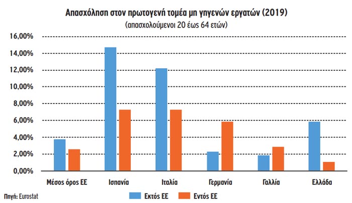 Στον παρακάτω πίνακα φαίνεται ο διαχωρισμός του εργατικού δυναμικού στον πρωτογενή τομέα σε εργάτες από ΕΕ και από Τρίτες Χώρες (στοιχεία 2019). Όπως φαίνεται, οι μεσογειακές χώρες, Ισπανία, Ιταλία και Ελλάδα απασχολούν πολύ περισσότερους μη Ευρωπαίους υπηκόους, ενώ η Γερμανία και η Γαλλία το αντίθετο.