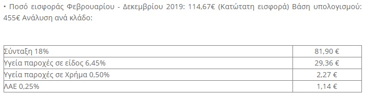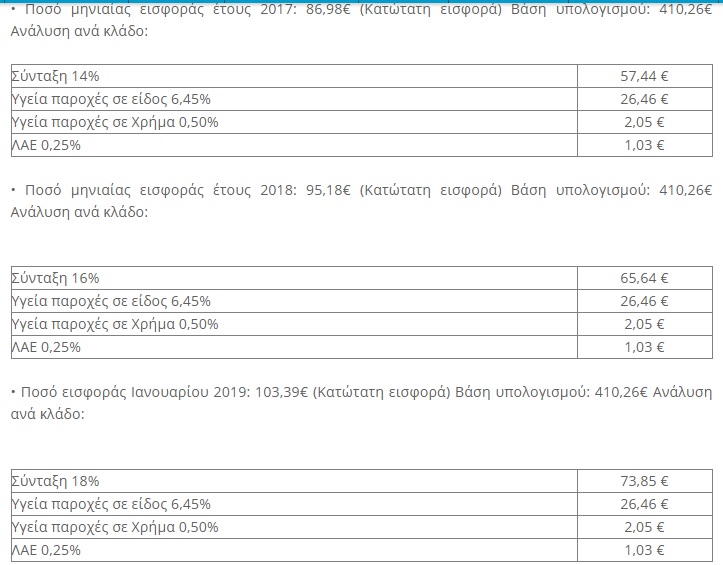 Ειδικότερα, για τον υπολογισμό των εισφορών για Κύρια Σύνταξη, Υγειονομική Περίθαλψη και Λογαριασμό Αγροτικής Εστίας (ΛΑΕ), ως κατώτατη μηνιαία βάση λαμβάνεται το 70% του κατώτατου βασικού μισθού άγαμου μισθωτού άνω των 25 ετών και υπολογίζεται, κατ’ έτος, ως εξής: