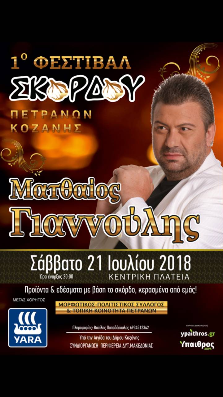 Στο πλαίσιο της προώθησης του προϊόντος στην ελληνική αγορά αλλά και της ανάδειξης της τοπικής διατροφικής τους κουλτούρας και παράδοσης, για πρώτη φορά, διοργανώνεται το Φεστιβάλ Σκόρδου Πετρανών στις 21 Ιουλίου. Στην εκδήλωση θα συμμετέχει και ο αγαπημένος καλλιτέχνης όλων, Ματθαίος Γιαννούλης και οι καταξιωμένοι συνεργάτες του.