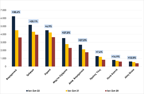 Σημαντική αύξηση στην αξία των εξαγωγών κατέγραψαν όλοι οι κλάδοι στο διάστημα Ιανουάριος-Σεπτέμβριος 2022 συγκριτικά με το αντίστοιχο διάστημα του 2021 και συγκεκριμένα: τα βιομηχανικά κατά €1.739,3 εκατ., δηλαδή 38,6%, τα τρόφιμα κατά €867,9 εκατ., δηλαδή 20,1%, τα χημικά κατά €290,2 εκατ., δηλαδή 6,9%, τα μηχανήματα και οχήματα κατά €755,5 εκατ., δηλαδή 27,2%, τα διάφορα βιομηχανικά προϊόντα κατά €579,7 εκατ., δηλαδή 27,7%, οι πρώτες ύλες κατά €91,9 εκατ., δηλαδή 7,6%, τα ποτά και καπνά κατά €118,3 εκατ., δηλαδή 16,9%, τα λίπη και έλαια κατά €68,6 εκατ., δηλαδή 12,5% και τα μη ταξινομημένα προϊόντα κατά €170,1 εκατ., δηλαδή 46,2%.