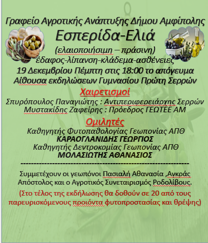 Εσπερίδα στην Πρώτη Σερρών για την ελιά στις 19/12