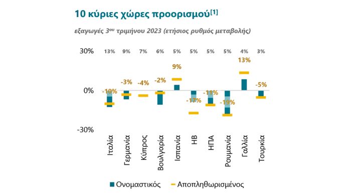 Κοιτάζοντας μπροστά, η εκτιμώμενη ανάκαμψη του διεθνούς εμπορίου το 2024 (+3,4% σε όγκους από +0,8% φέτος) αναμένεται να ενισχύσει σημαντικά τις ελληνικές εξαγωγές. Ωστόσο, τρεις παράγοντες αναμένεται να φρενάρουν μερικώς αυτή τη δυναμική: