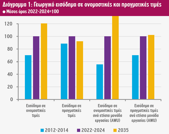Μετά από μια περίοδο σταθεροποίησης μεταξύ 2024 και 2027, σύμφωνα με τους αναλυτές της Κομισιόν, το εισόδημα των συντελεστών παραγωγής σε ονομαστικούς όρους αναμένεται να αυξηθεί από το 2028 και μετά με ρυθμό 1,4% ετησίως μέχρι το 2035. Ωστόσο, αν συνυπολογιστεί ο μέσος ετήσιος πληθωρισμός, σε πραγματικούς όρους, το γεωργικό εισόδημα θα μειωθεί με μέσο ετήσιο ρυθμό 0,6% από το 2028 έως το 2035. Τα πράγματα είναι καλύτερα εάν εξετάσουμε το εισόδημα συντελεστή ανά ετήσια μονάδα εργασίας (AWU). Σε αυτή την περίπτωση, το ονομαστικό εισόδημα συντελεστών παραγωγής ανά AWU αυξάνεται με ταχύτερο ρυθμό από το 2028 έως το 2035 (+2,2%), ενώ σε πραγματικούς όρους αυξάνεται με χαμηλότερο ρυθμό (+0,2%) κατά την ίδια περίοδο.