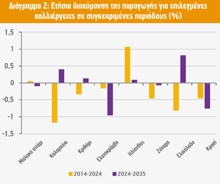 Η αύξηση των αποδόσεων και της παραγωγής θα είναι μικρότερη, σε σχέση με τη δεκαετία 2014-2024 κι αυτό γιατί η κλιματική αλλαγή έχει δημιουργήσει προβλήματα στη διαθεσιμότητα των εδαφών (π.χ. πλημμύρες και διάβρωση) και των νερών, παρόλο που τα τεχνολογικά εργαλεία για αύξηση των αποδόσεων θα είναι περισσότερα για τους αγρότες. Επίσης, η αλλαγή των διατροφικών συνηθειών, όπως η μείωση της κατανάλωσης κρέατος και αλκοόλ, θα επηρεάσει σημαντικά τις προοπτικές της ευρωπαϊκής γεωργίας και κτηνοτροφίας έως το 2035. Τέλος, οι αυξημένες απαιτήσεις των καταναλωτών για φιλοπεριβαλλοντικές πρακτικές ενδέχεται να επηρεάσουν τη συνολική παραγωγή αγροτικών προϊόντων εντός ΕΕ.