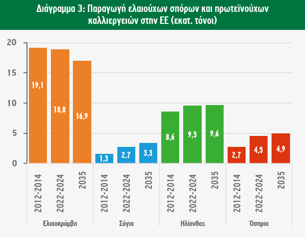 Οι αποδόσεις της σόγιας, του ηλίανθου, της ελαιοκράμβης και των οσπρίων στην ΕΕ προβλέπεται να αυξηθούν οριακά έως το 2035 (κατά 3,9%, 1,4%, 0,1% και 0,4% σε σύγκριση με την περίοδο 2022-2024, αντίστοιχα), ιδίως αν ληφθούν υπόψη οι χαμηλές αποδόσεις της περιόδου 2022-2024. Συνολικά, η παραγωγή ελαιούχων σπόρων και πρωτεϊνούχων καλλιεργειών προβλέπεται να αυξηθεί σε 34,9 εκατ. τόνους έως το 2035 (+2,1% σε σύγκριση με την περίοδο 2022-2024). Οι λόγοι αυτής της επέκτασης περιλαμβάνουν τις υποστηρικτικές πολιτικές της ΕΕ για τις πρωτεϊνούχες καλλιέργειες και την αυξανόμενη ζήτηση τροφίμων για φυτικές πρωτεΐνες, η οποία θα επηρεάσει θετικά τη ζήτηση για όσπρια. Η παραγωγή σόγιας θα αυξηθεί κατά 22% σε σχέση με την περίοδο 2022-2024 (κυρίως λόγω της μεγαλύτερης καλλιεργούμενης έκτασης) και η παραγωγή οσπρίων προβλέπεται να αυξηθεί κατά 9,9%, φθάνοντας τους 4,9 εκατ. τόνους το 2035. Η παραγωγή ελαιοκράμβης προβλέπεται να μειωθεί κατά -10%.