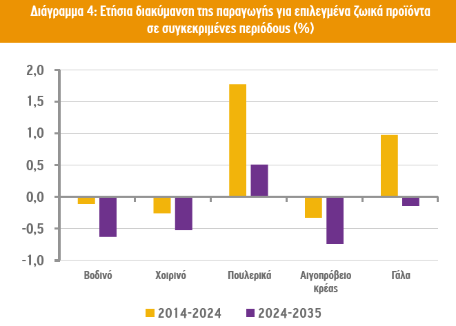 Η παραγωγή γάλακτος στην ΕΕ θα συνεχίσει να καθοδηγείται από την αυξανόμενη συμβολή του τομέα σε πιο βιώσιμα γεωργικά και διατροφικά συστήματα, δημιουργώντας μεγαλύτερη προστιθέμενη αξία στον τομέα. Παρά τη μείωση της συλλογής γάλακτος, οι αλλαγές στον τρόπο ζωής και οι αυξανόμενες απαιτήσεις υγείας θα μπορούσαν να αυξήσουν τη ζήτηση για εμπλουτισμένα και λειτουργικά γαλακτοκομικά προϊόντα, καθώς και για γαλακτοκομικά προϊόντα με χαμηλότερη περιεκτικότητα σε λιπαρά και ζάχαρη. Οι αγελάδες γαλακτοπαραγωγής αναμένεται να μειωθούν κατά 11% στη δεκαετία και τα βοοειδή για κρέας κατά 9,6%. Η παραγωγή βόειου κρέατος θα φτάσει τους 6,3 εκατ. τόνους το 2035 (-6,7% σε σχέση με τον μέσο όρο της περιόδου 2022-2024). Όσον αφορά την παραγωγή χοιρινού κρέατος στην ΕΕ, αυτή προβλέπεται να μειωθεί κατά 0,5% ετησίως, μέχρι το 2035, σε αντίθεση με την παραγωγή κρέατος πουλερικών, η οποία θα αυξάνεται με ετήσιο ρυθμό +0,5% για να φτάσει τους 770.000 τόνους το 2035.