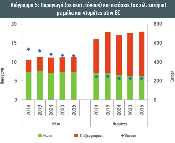 Η συνολική παραγωγή μήλων στην ΕΕ εκτιμάται ότι θα παραμείνει σταθερή την περίοδο 2024-2035 σε 11,4 εκατ. τόνους. Αυτό οφείλεται από τη μία στη μείωση των καλλιεργούμενων εκτάσεων και από την άλλη στην αύξηση των αποδόσεων, λόγω εισαγωγής νέων, υψηλής απόδοσης ποικιλιών και βελτιωμένης αγρονομικής διαχείρισης. Μέχρι το 2035, προβλέπεται ότι 7,4 εκατ. τόνοι μήλων θα καταναλώνονται νωπά, ενώ 4 εκατ. τόνοι θα μεταποιούνται.