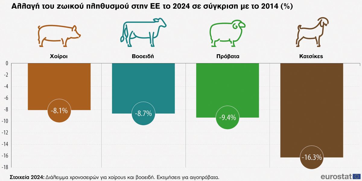 Η μείωση αυτή ενισχύει τη μακροπρόθεσμη τάση συρρίκνωσης των ζωικών πληθυσμών στην ΕΕ. Σε σχέση με το 2014, ο πληθυσμός των χοίρων έχει μειωθεί κατά 8,1%, των βοοειδών κατά 8,7%, των προβάτων κατά 9,4% και των κατσικών κατά 16,3%. Η πτωτική αυτή πορεία αντανακλά ευρύτερες αλλαγές στον αγροδιατροφικό τομέα, περιλαμβανομένων των μεταβαλλόμενων διατροφικών συνηθειών, των περιβαλλοντικών ανησυχιών και της πολιτικής για βιώσιμη γεωργία εντός της Ευρωπαϊκής Ένωσης.