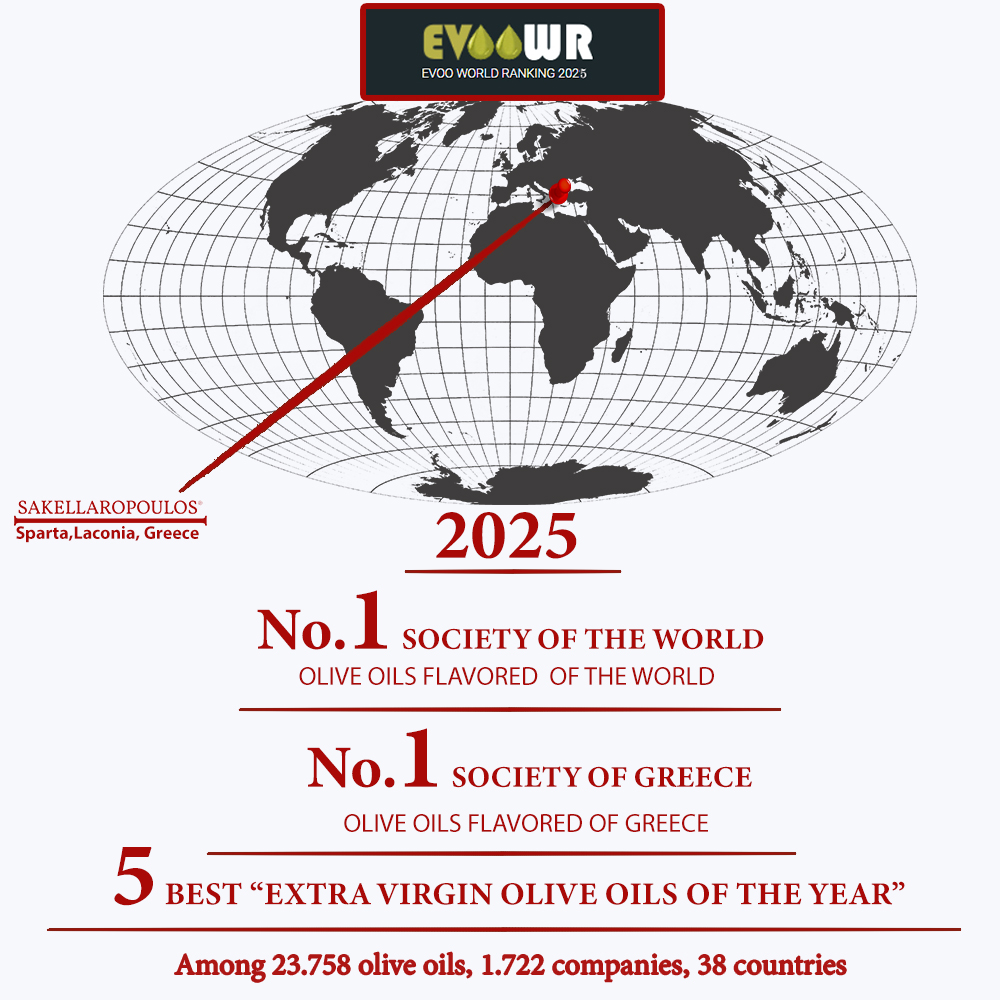Παράλληλα, στην παγκόσμια κατάταξη ελαιολάδων EVOOWR 2025, οι ελαιώνες Σακελλαρόπουλου τιμήθηκαν με πολύ υψηλές και τιμητικές θέσεις για τα εξαιρετικά παρθένα ελαιόλαδα τους.
