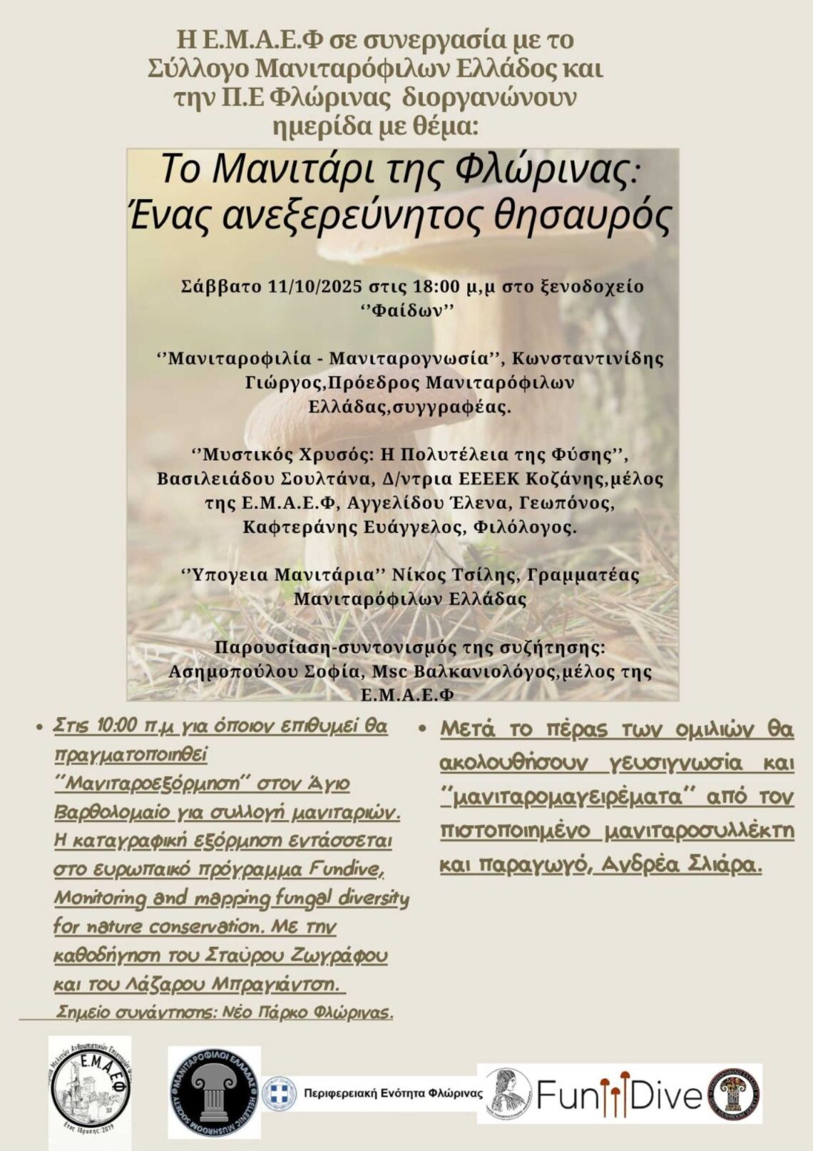 Το πρωί της ίδιας ημέρας, στις 10:00, θα πραγματοποιηθεί μανιταροεξόρμηση στον Άγιο Βαρθολομαίο, στο πλαίσιο ευρωπαϊκού προγράμματος καταγραφής ειδών. Το σημείο συνάντησης ορίζεται στο Νέο Πάρκο Φλώρινας, ενώ τη δράση θα καθοδηγήσουν οι Σταύρος Ζωγράφος και Λάζαρος Μπραγιάντσης, προσφέροντας στους συμμετέχοντες μια βιωματική γνωριμία με τα είδη που φύονται στην περιοχή και τις αρχές της ασφαλούς συλλογής.