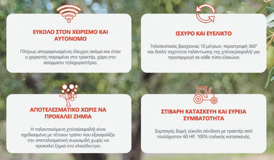 Ο τηλεσκοπικός βραχίονας έχει εμβέλεια έως 10 μέτρα με περιστροφή 360°, ενώ η χτένα (κεφαλή) διαθέτει διπλή ταχύτητα ταλάντωσης για προσαρμογή σε κάθε τύπο ελαιώνα.