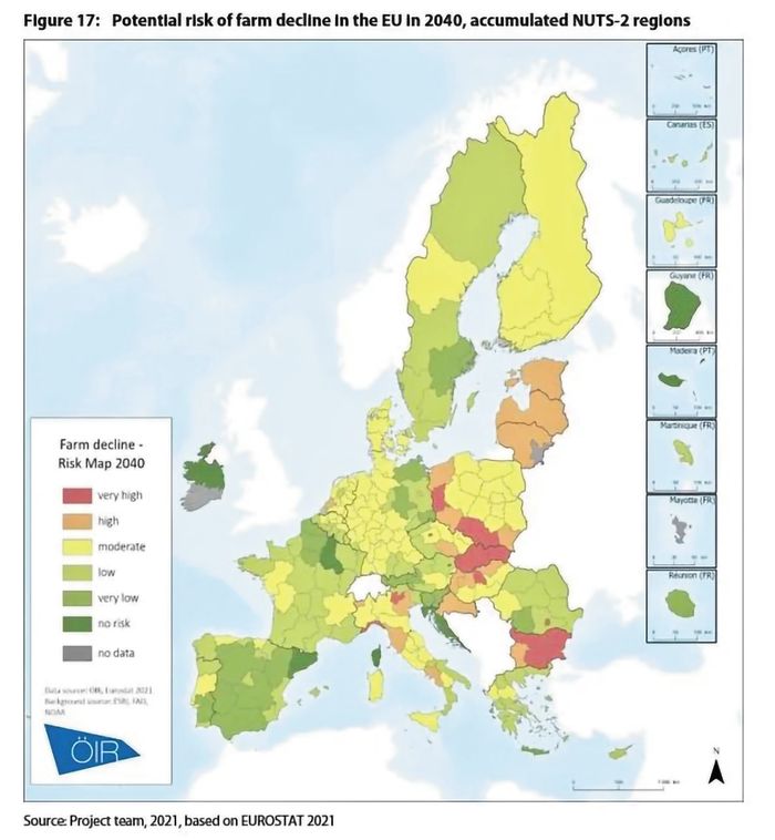 Ειδικότερα, προβλέπεται ότι οι περισσότερες περιφέρειες (NUTS-2) διατρέχουν μέτριο κίνδυνο μείωσης του πρωτογενούς τομέα έως το 2040, δηλαδή μείωση των εκμεταλλεύσεων από 40% έως 60%. Ωστόσο, περίπου το 16% των περιοχών NUTS-2 έχει υψηλό έως και πολύ υψηλό δυνητικό κίνδυνο (έως 80%) μείωσης των γεωργικών τους εκμεταλλεύσεων. Τέτοιες περιφέρειες εντοπίζονται σε Βουλγαρία, Ουγγαρία, Πολωνία, Ιταλία, Σλοβακία, Τσεχία και κράτη της Βαλτικής.