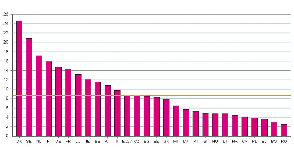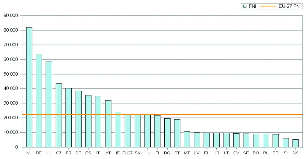 Στις πρώτες δέκα θέσεις βρίσκονται η Σλοβακία, η Ολλανδία, η Τσεχία, η Δανία, η Γερμανία, το Βέλγιο, η Λιθουανία, η Γαλλία, η Ισπανία και η Σουηδία. Αξίζει, πάντως, να σημειωθεί ότι οι μισές εκμεταλλεύσεις που περιλαμβάνονται στη μελέτη παρουσίασαν FNVA ανά Ετήσια Μονάδα Εργασίας κάτω από 10.000 ευρώ.