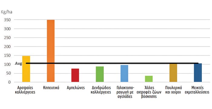 Σύμφωνα με το σχετικό διάγραμμα, οι μονάδες κηπευτικών έχουν μακράν τον πρώτο λόγο στη χρήση λιπασμάτων. Συγκεκριμένα, η μέση χρήση λιπασμάτων ανά εκτάριο και ανά τύπο εκμετάλλευσης διαμορφώνεται στα 350 κιλά/εκτάριο στα κηπευτικά. Ακολουθούν οι αροτραίες καλλιέργειες (σιτηρά, ελαιούχα, πρωτεϊνούχα) με περίπου 150 κιλά/εκτάριο γης και οι μονάδες χοιροτροφίας και πουλερικών με μέση χρήση 100 κιλά/εκτάριο γης. Πολύ χαμηλότερη είναι η μέση χρήση λιπάσματος των αμπελοοινικών εκμεταλλεύσεων, ενώ η μικρότερη χρήση μεταξύ των οκτώ τύπων εκμετάλλευσης καταγράφεται σε αιγοπροβατοτροφικές εκμεταλλεύσεις.