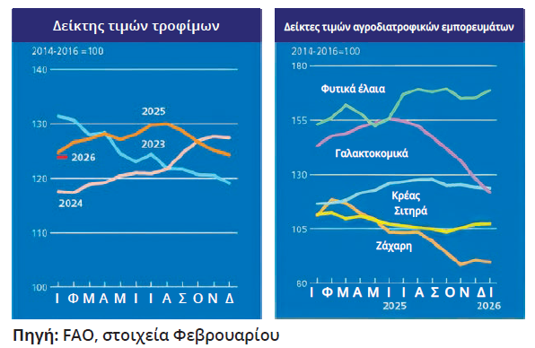 Πιο συγκεκριμένα, ο Δείκτης Τιμών Τροφίμων του FAO διαμορφώθηκε κατά μέσο όρο στις 123,9 μονάδες τον Ιανουάριο, παρουσιάζοντας υποχώρηση κατά 0,4% σε σύγκριση με τον Δεκέμβριο και 0,6% σε ετήσια βάση. Ο δείκτης καταγράφει τις μηνιαίες μεταβολές στις διεθνείς τιμές ενός καλαθιού βασικών αγροδιατροφικών προϊόντων που διακινούνται παγκοσμίως.