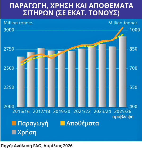 Ταυτόχρονα, ο Οργανισμός για τη Γεωργία και τα Τρόφιμα των Ηνωμένων Εθνών, προβλέπει άνεση στη διαθεσιμότητα αλλά και ασφάλεια χωρίς όμως να λείπουν οι προκλήσεις. Σύμφωνα με τις εκτιμήσεις, τα παγκόσμια αποθέματα σιτηρών στο τέλος της περιόδου 2025/2026, σημειώνοντας περαιτέρω άνοδο, αναμένεται να φτάσουν τους 951,5 εκατ. τόνους, αυξημένα κατά 9,2% σε σχέση με το προηγούμενο έτος. Η αύξηση οφείλεται κυρίως σε υψηλότερα αποθέματα σιταριού στην ΕΕ, λόγω βραδύτερων εξαγωγών, και στο Ιράν, λόγω ταχύτερων εισαγωγών. Αυξήσεις παρατηρούνται, επίσης, στο Ουζμπεκιστάν και την Ινδία. Ο λόγος αποθεμάτων προς κατανάλωση εκτιμάται στο 32,2%, υποδηλώνοντας επαρκή προσφορά. Τα παγκόσμια αποθέματα ρυζιού προβλέπεται να αυξηθούν κατά 4,2%, φτάνοντας τους 219,3 εκατομμύρια τόνους, λόγω συσσώρευσης τόσο σε εξαγωγικές όσο και σε εισαγωγικές χώρες.