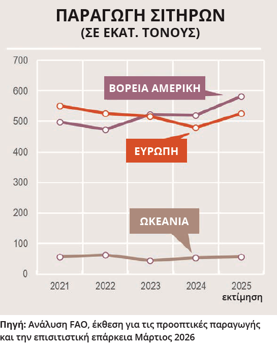Η παγκόσμια παραγωγή σιτηρών συνεχίζει να κινείται σε ιστορικά υψηλά επίπεδα, παρά τις προκλήσεις από τις τιμές εισροών, τις ακραίες καιρικές συνθήκες και τις γεωπολιτικές εντάσεις. Σύμφωνα με την έκθεση του FAO για τις προοπτικές των καλλιεργειών και την επισιτιστική κατάσταση του Μαρτίου (η έκθεση δημοσιεύεται τρεις φορές το χρόνο), το 2026 αναμένεται, ωστόσο, μια μείωση στη συνολική παραγωγή σιτηρών κατά περίπου 3% σε σχέση με το 2025, κυρίως λόγω μειωμένων σπορών και επιστροφής σε μέσες αποδόσεις, μετά τα εξαιρετικά υψηλά επίπεδα του προηγούμενου έτους.