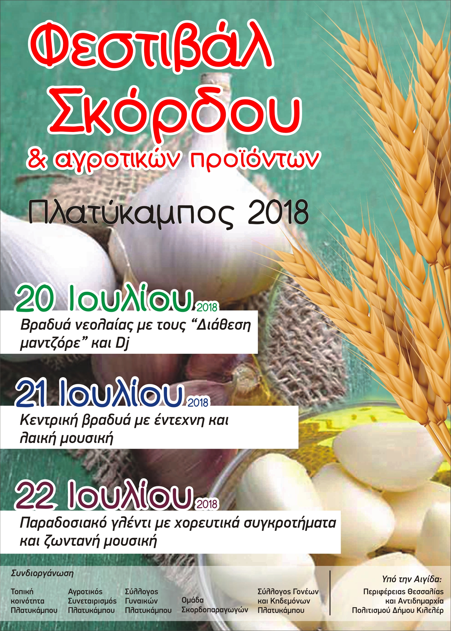«Φεστιβάλ Σκόρδου και Αγροτικών Προϊόντων» θα γίνει στον Πλατύκαμπο Λάρισας από μεθαύριο Παρασκευή 20 Ιουλίου έως και την Κυριακή 22 στην πλατεία του χωριού. Το φεστιβάλ διοργανώνεται από την Αντιδημαρχία της ΔΕ Πλατυκάμπου, την Τοπική Κοινότητα Πλατυκάμπου, τον Αγροτικό Συνεταιρισμό, τον Σύλλογο Γυναικών και τον Σύλλογο Γονέων και Κηδεμόνων Πλατυκάμπου. Η ώρα έναρξης των εκδηλώσεων είναι στις 9 μ.μ., ενώ το πρόγραμμα έχει ως εξής: