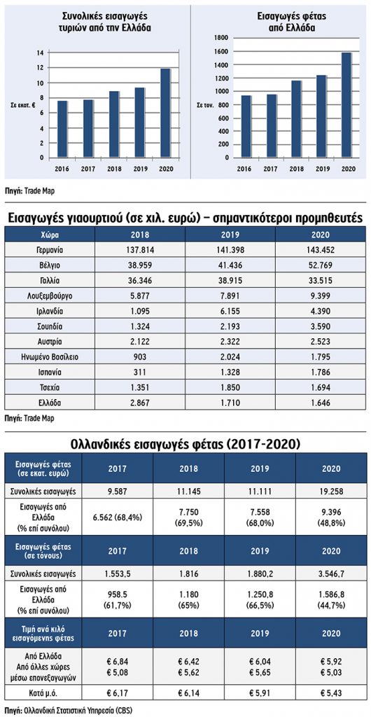 Το 75%-80% των ολλανδικών εισαγωγών τυριών από την Ελλάδα αποτελεί η φέτα (1.587 τόνοι από 2.122), ενώ, πέραν αυτής, από τη χώρα μας εισάγει κεφαλοτύρι, ακόμη και gouda, κεφαλογραβιέρα και κασέρι, αποτελώντας τον δέκατο σημαντικότερο προορισμό για τα προϊόντα της ελληνικής τυροκομίας την ίδια χρονιά.