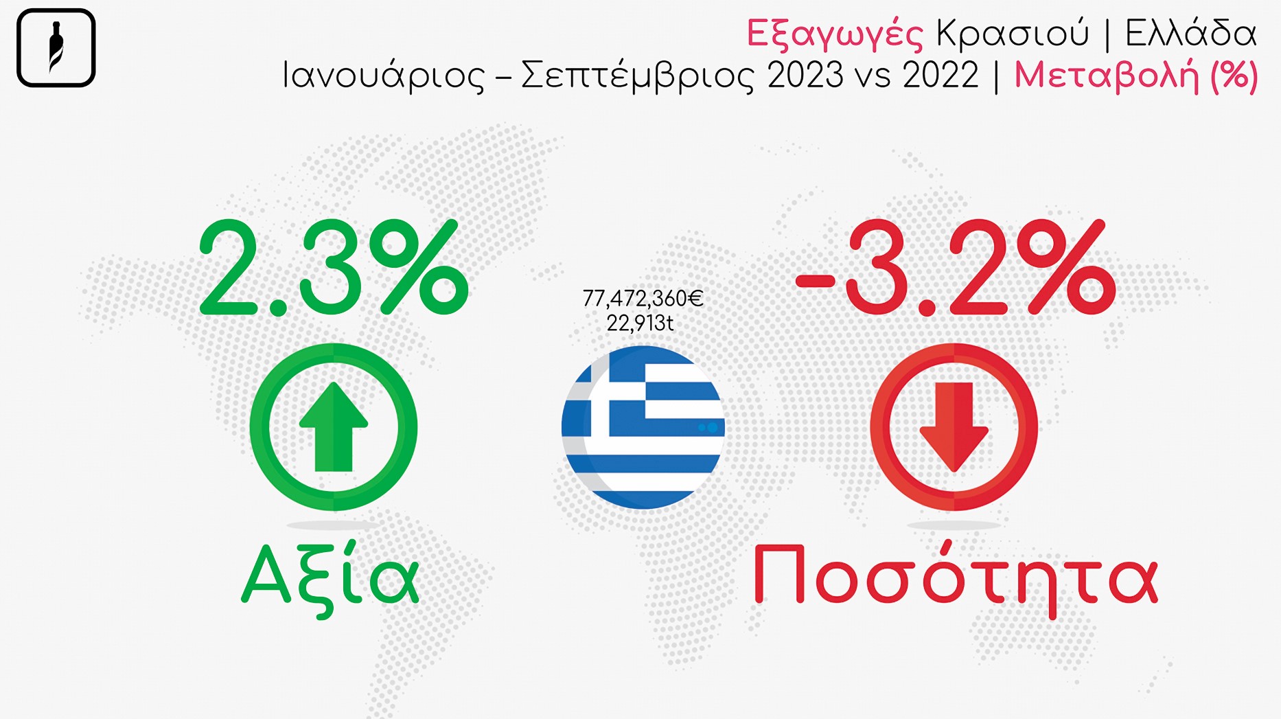 Σύμφωνα με το Μηνιαίο Παρατηρητήριο Eξαγωγών της εξειδικευμένης πλατφόρμας Oensights.com, που επεξεργάζεται στοιχεία της ΕΛΣΤΑΤ, στο διάστημα Ιανουάριος-Σεπτέμβριος 2023, οι ελληνικές εξαγωγές οίνου όλων των κατηγοριών άγγιξαν σε αξία τα 77,5 εκατ. ευρώ (77,472 εκατ. ευρώ), με τον όγκο τους ωστόσο να υποχωρεί κατά 3,2%.