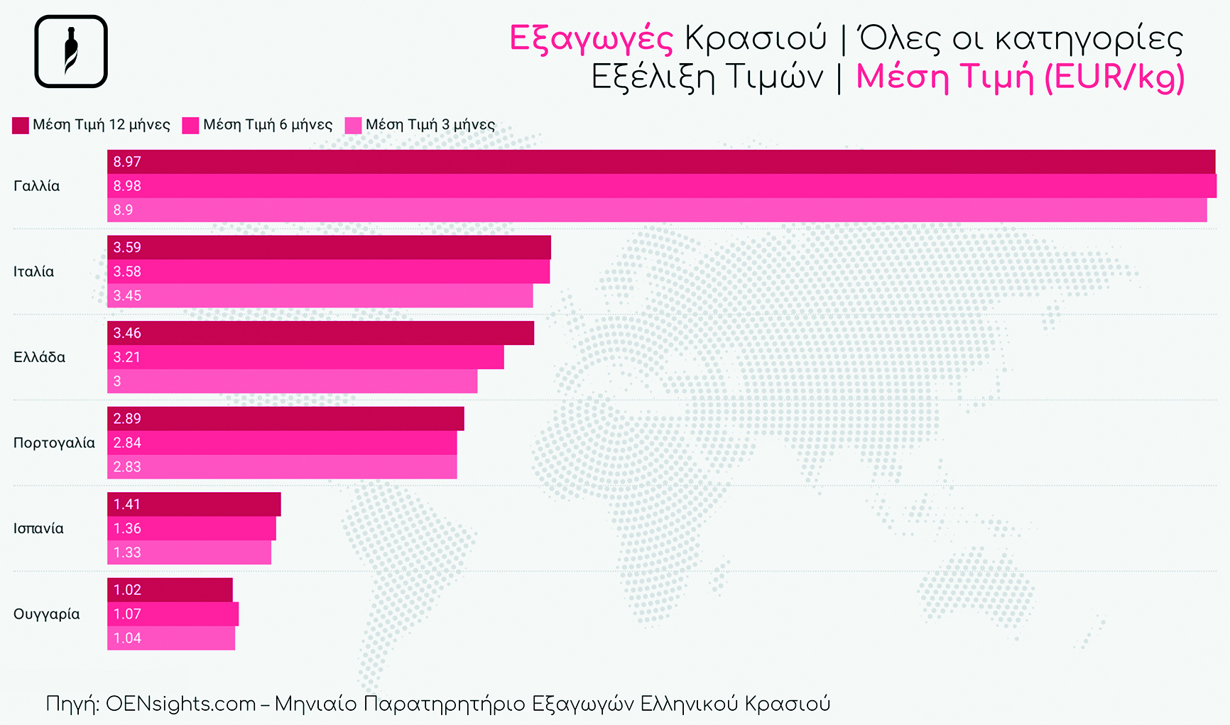 Στο πεδίο των τιμών, πάντως, η Γαλλία είναι αυτή που διατηρεί τα πρωτεία, με μεγάλη διαφορά μάλιστα από τον δεύτερο. Σύμφωνα με τα στοιχεία της Oensights, η μέση τιμή εξαγωγής για όλες τις κατηγορίες κρασιών κινήθηκε γύρω στα 8,9 ευρώ/κιλό καθ’ όλη τη διάρκεια του τελευταίου δωδεκαμήνου. Στις εξαγωγικές τιμές της Ελλάδας, παρατηρείται μια υποχώρηση όσο μικραίνει το χρονικό «παράθυρο», καθώς η μέση τιμή των τελευταίων δώδεκα μηνών ανέρχεται σε 3,46 ευρώ/κιλό, ωστόσο οι αντίστοιχες τιμές για το εξάμηνο και το τρίμηνο είναι 3,21 και 3 ευρώ/κιλό. Μέρος αυτής της υποχώρησης θα μπορούσε να αποδοθεί στους μεγάλους όγκους χύμα κρασιού που, σύμφωνα με στελέχη της αγοράς, πωλήθηκαν τον Ιούλιο στη Γαλλία (κάτι που συνέβη και πέρυσι).