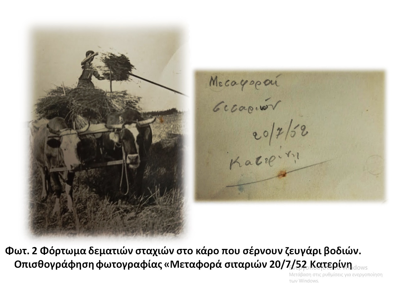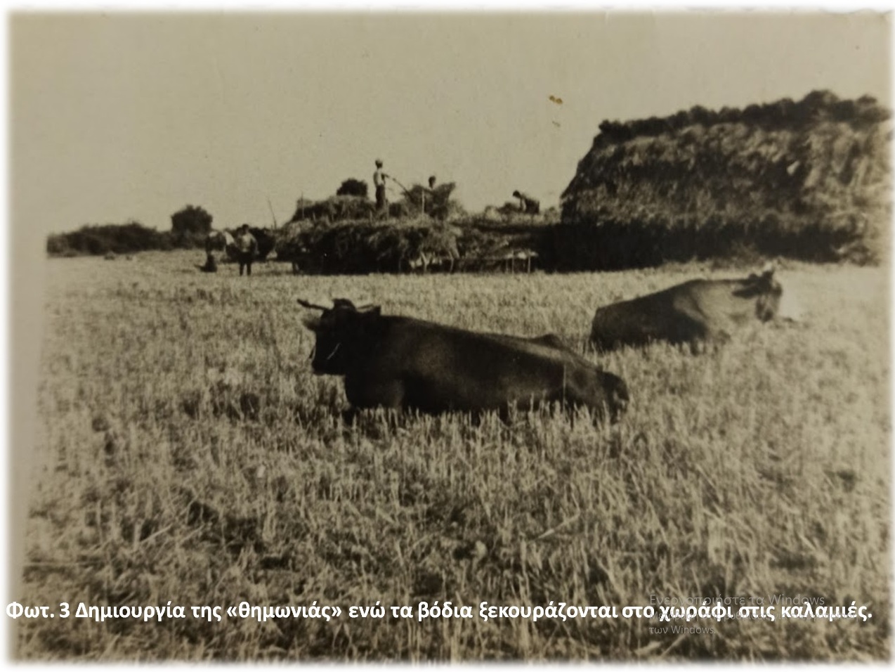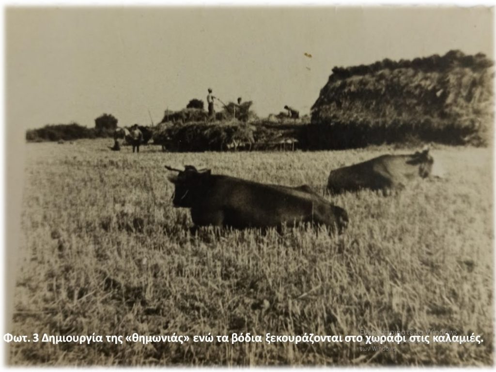 Στις φωτογραφίες (1 & 2) βλέπουμε να φορτώνονται τα «δεμάτια» στα κάρα που σέρνουν βόδια. Διακρίνονται, επάνω στο κάρο όπου τοποθετεί τα «δεμάτια» ο Πέτρος Δ. Ρουκάς (+2007), ενώ κάτω ο Αριστείδης Δ. Ρουκάς (+1990) δίνει τα «δεμάτια». Στην φωτογραφία (3) βλέπουμε την δημιουργία της μεγάλης «θημωνιάς» με την ταξινόμηση σε σωρό των «δεματιών», κοντά σε χώρο όπου να είχε πρόσβαση η αλωνιστική μηχανή, η ονομαζόμενη « πατόζα». Όση ώρα ξεφορτώνεται το κάρο από τα «δεμάτια» τα βόδια ξεκουράζονται στο χωράφι στις καλαμιές.