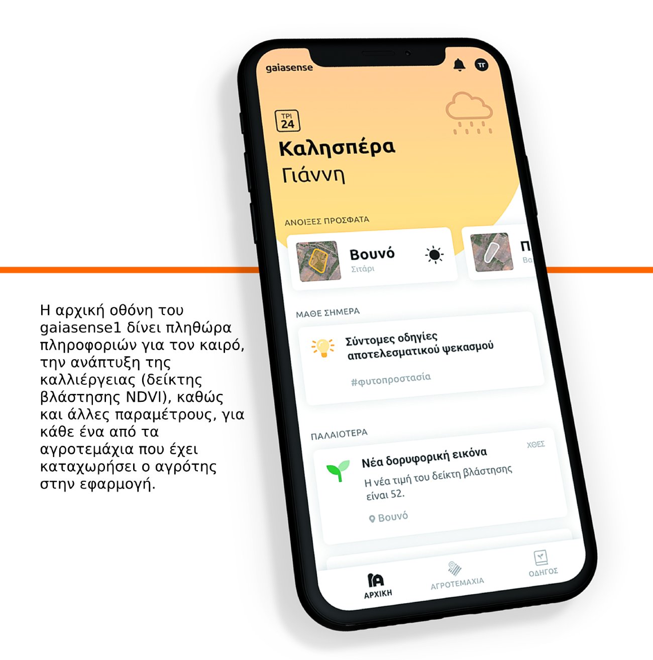 Το gaiasense1 είναι μια εύχρηστη και ολοκληρωμένη εφαρμογή που φέρνει την ευφυή γεωργία στο έξυπνο κινητό (smartphone) του αγρότη. Χρησιμοποιώντας την τεχνολογική υποδομή και τις υπηρεσίες του συστήματος ευφυούς γεωργίας gaiasense της NEUROPUBLIC, το gaiasense 1 παρέχει προσωποποιημένη πληροφόρηση σε θέματα που επηρεάζουν άμεσα την αγροτική παραγωγή και βοηθούν τον αγρότη να πάρει αμεσότερα τις καλύτερες δυνατές αποφάσεις για τη διαχείριση της παραγωγής του.