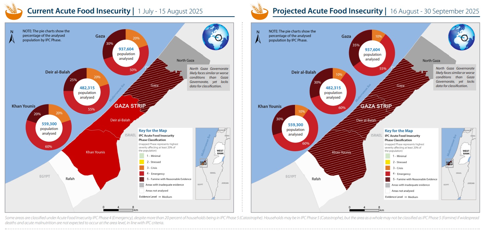 Δυστυχώς, οι συνθήκες αναμένεται να συνεχίσουν να επιδεινώνονται με ραγδαίους ρυθμούς. Μέχρι τα τέλη Σεπτεμβρίου, περισσότεροι από 640.000 άνθρωποι εκτιμάται ότι θα αντιμετωπίσουν καταστροφικά επίπεδα πείνας (Φάση 5 στην κλίμακα IPC) σε όλη τη Λωρίδα της Γάζας. Επιπλέον 1,14 εκατ. άνθρωποι θα βρίσκονται σε «έκτακτη ανάγκη» (Φάση 4 στην κλίμακα IPC) και άλλοι 396.000 άνθρωποι σε «κρίση» (Φάση 3 στην κλίμακα IPC). Να σημειωθεί ότι οι συνθήκες στη Βόρεια Γάζα εκτιμάται ότι είναι εξίσου σοβαρές –ή και χειρότερες– από ό,τι στην Πόλη της Γάζας, ωστόσο, τα περιορισμένα δεδομένα που υπάρχουν εμποδίζουν την ταξινόμηση από την IPC, υπογραμμίζοντας την επείγουσα ανάγκη πρόσβασης για σκοπούς αξιολόγησης και παροχής βοήθειας. Η περιοχή της Ράφα δεν αναλύθηκε, δεδομένων των ενδείξεων ότι είναι σε μεγάλο βαθμό ερημωμένη.