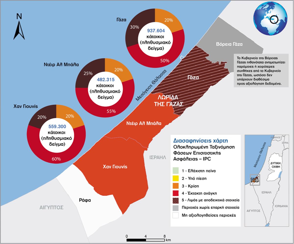 «Πάνω από το 98% των καλλιεργήσιμων εκτάσεων στη Λωρίδα της Γάζας είναι είτε κατεστραμμένο, είτε απρόσιτο, είτε και τα δύο. Η κτηνοτροφία έχει αποδεκατιστεί και οι αλιευτικές δραστηριότητες έχουν απαγορευθεί. Μεγάλο μέρος των υποδομών, που είναι απαραίτητες για τη ροή και την αποθήκευση των εισαγωγών τροφίμων, έχει υποστεί σοβαρές ζημιές ή έχει καταστραφεί. Τα μετρητά είναι εξαιρετικά δυσεύρετα και οι αυξανόμενες τιμές της αγοράς έχουν καταστήσει τα περιορισμένα τρόφιμα που είναι διαθέσιμα μη προσιτά για τα περισσότερα νοικοκυριά», περιγράφεται στην έκθεση της IPC.