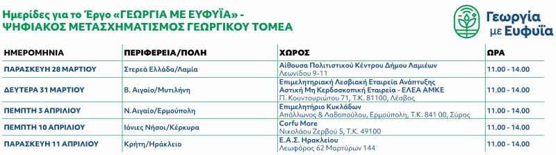 Στόχος των ημερίδων, που πραγματοποιούνται σε κάθε περιφέρεια της χώρας, είναι να παρουσιαστεί το αντικείμενο και οι στόχοι του Έργου, τα οφέλη της ευφυούς γεωργίας για τους παραγωγούς και όλους τους εμπλεκόμενους στον πρωτογενή τομέα, καθώς και η τεχνολογική πλατφόρμα ευφυούς γεωργίας. Το Έργο υλοποιείται από το υπουργείο Αγροτικής Ανάπτυξης και Τροφίμων, με ανάδοχο την Ένωση Εταιρειών «NEUROPUBLIC – OTE – ΣΚΑΡΜΟΥΤΣΟΣ ΓΕΩΡΓΙΟΣ».