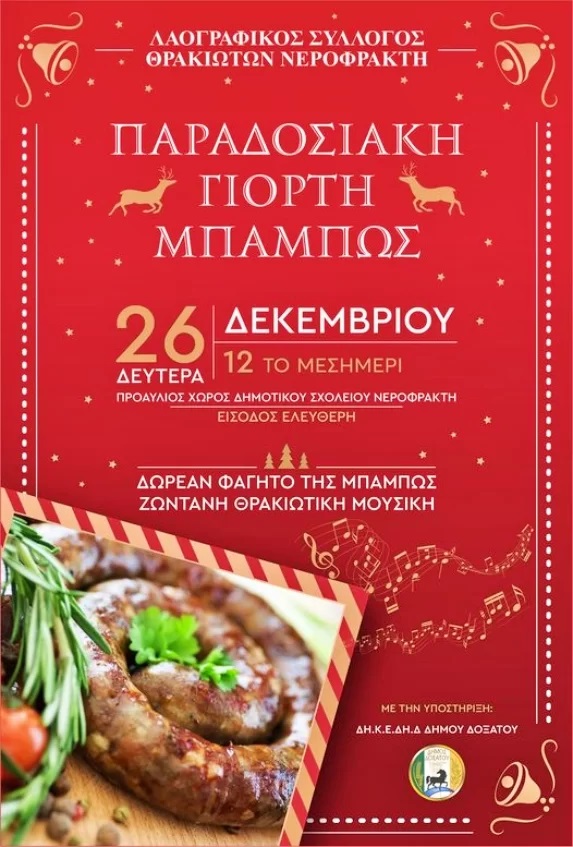 Τα μέλη του συλλόγου θα ετοιμάσουν και θα προσφέρουν σε όλο τον κόσμο το παραδοσιακό Θρακιώτικο φαγητό που δεν λείπει από κανένα τραπέζι την ημέρα των Χριστουγέννων, την Μπάμπω.