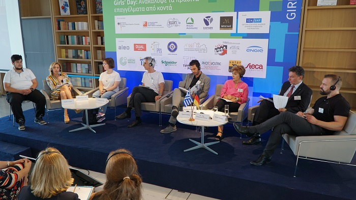 Ακολούθησε συζήτηση με θέμα: «Τα κορίτσια στα ‘πράσινα’ επαγγέλματα. Καινοτόμες ιδέες για την επαγγελματική εκπαίδευση» στο πλαίσιο του ελληνογερμανικού διαλόγου. Στο πάνελ συμμετείχαν η κα Νατάσσα Σακκά, Προϊσταμένη Διεύθυνσης Αρχικής Επαγγελματικής Εκπαίδευσης, Ο.Α.Ε.Δ., ο Δρ. Μηχ. Αθανάσιος Κελέμης, Γενικός Διευθυντής και Μέλος Δ.Σ. του Ελληνογερμανικού Εμπορικού και Βιομηχανικού Επιμελητηρίου, ο κ. Hannes Barske, DLR (German Aerospace Center), ο κ. Δημήτρης Μαναγούδης, Γενικός Διευθυντής ICON GROUP και ο κύριος Wolfgang Jung, Γενικός Διευθυντής Wissenschaftspark Gelsenkirchen. Το λόγο πήραν επίσης δυο μαθητές και μία εκπαιδευτικός, για να παρουσιάσουν το ζήτημα από τη δική τους οπτική.