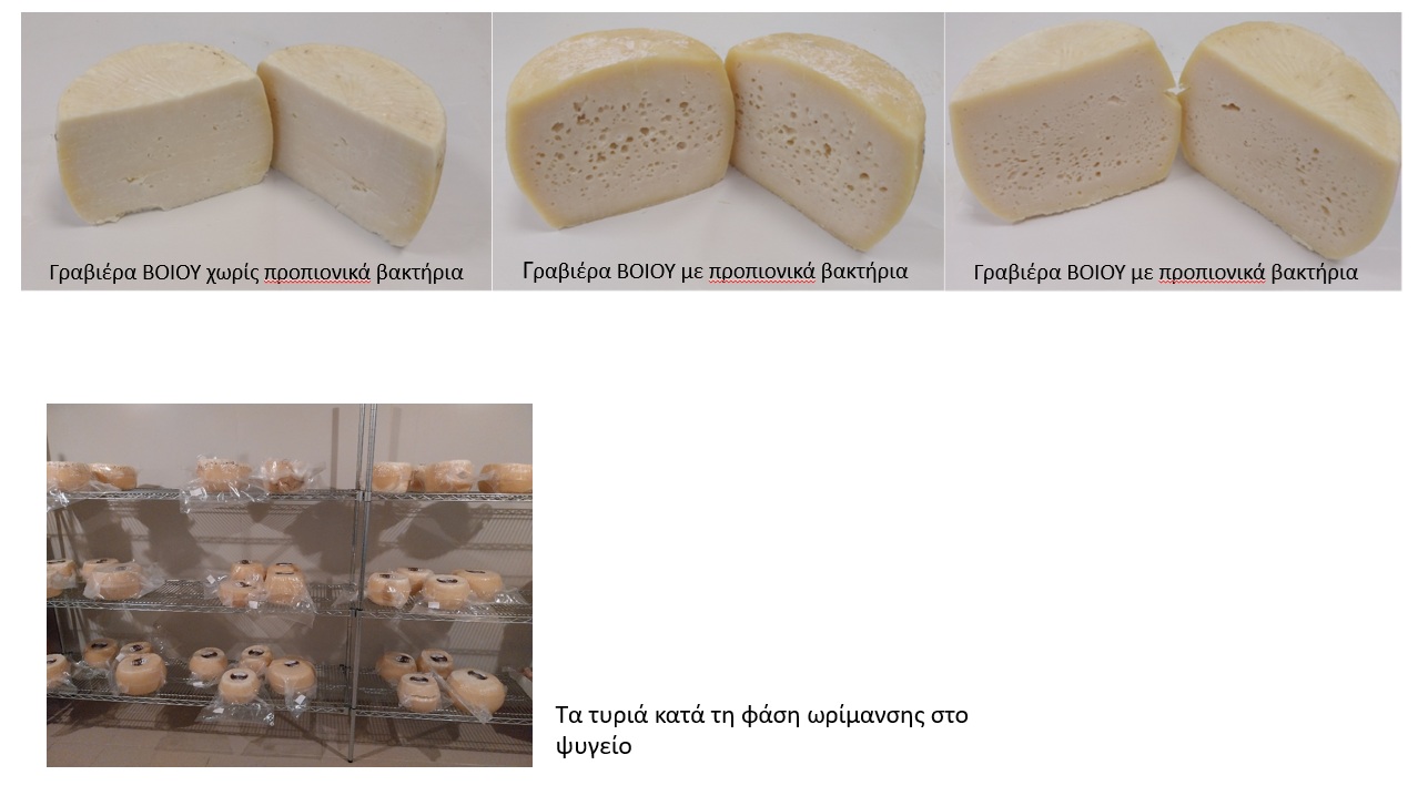 Και συνεχίζει: «Το γάλα παστεριώνεται υποχρεωτικά, οπότε στη συνέχεια χρειάζεται να εμπλουτιστεί με μικροοργανισμούς, οι οποίοι θα ζυμώσουν τη λακτόζη. Αυτοί είναι οι οξυγαλακτικοί μικροοργανισμοί, που θα παραγάγουν γαλακτικό οξύ. Προσθέτουμε και προπιονικά βακτήρια, τα οποία έχουν την ιδιότητα να ζυμώνουν το γαλακτικό οξύ και να παράγουν προπιονικό οξύ και διοξείδιο του άνθρακα. Το διοξείδιο του άνθρακα είναι αυτό που πιέζει τη μάζα του τυριού και κάνει αυτές τις οπές που βλέπουμε στη γραβιέρα. Τα προπιονικά παράγουν βιταμίνη B12, οπότε και το τελικό προϊόν πιθανόν να είναι εμπλουτισμένο με βιταμίνη Β12».