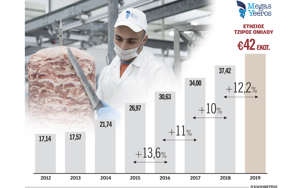 Το 2019 ο κύκλος εργασιών της Megas Yeeros διαμορφώθηκε σε 42 εκατ. ευρώ, εκ των οποίων 15 εκατ. ευρώ ήταν οι πωλήσεις εκτός Ελλάδας (6 εκατ. ευρώ οι εξαγωγές από την Ελλάδα και 9 εκατ. ευρώ οι πωλήσεις από τις ΗΠΑ).
